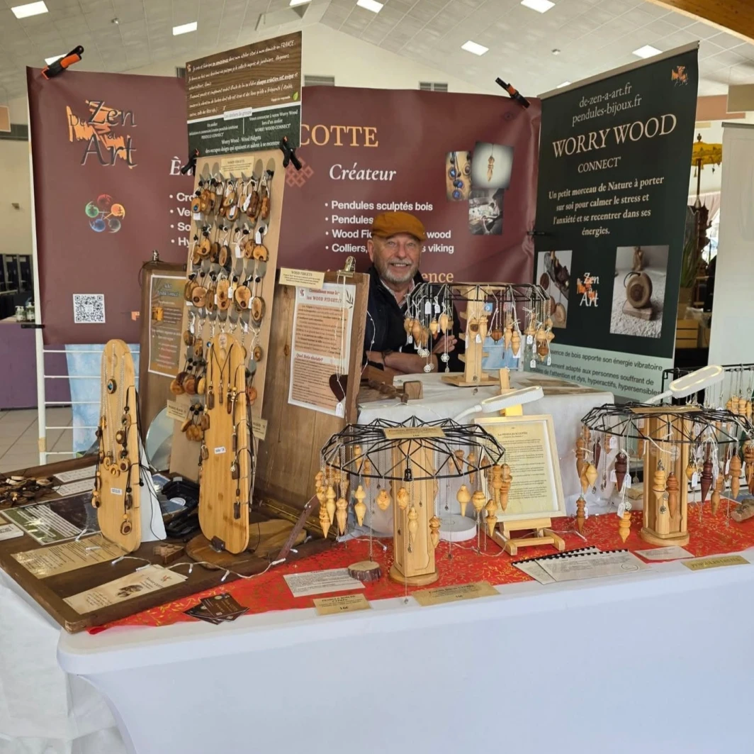 Sur mon stand De Zen à Art, vous découvrirez les pendules du chamane, sculptés au couteau , en conscience comme sont confectionnés les tambours chamaniques.et des pendules tournés .